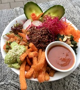 California Bowl - Roter Quinoa, Süßkartoffelsticks, Tamari-Spinat, Walnuss, Mango Möhren Salat, Avocado, Sesam, Tomaten-Koriander-Salsa, Dattel-Teriyaki-Sauce, Mixed Greens mit Superfooddressing